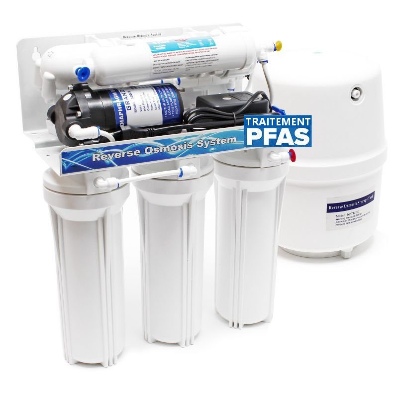 Les PFAS sont des composés chimiques persistants qui s’accumulent dans l’eau et dans le corps. Grâce au charbon actif compressé et à la membrane d’osmose inverse, ce système réduit efficacement leur présence pour vous offrir une eau plus sûre. La combinaison du charbon actif et des deux membranes d’osmose inverse, ce système réduit efficacement les PFAS, aussi appelés « polluants éternels ». Les membranes RO sont une des méthodes les plus performantes pour éliminer ces substances chimiques contaminantes persistantes présentes dans l’eau potable. Avec notre gamme d’osmoseurs domestiques 50 à 400 GPD, vous bénéficiez d’une eau purifiée, bonne pour votre santé et celle de vos proches tous les jours.